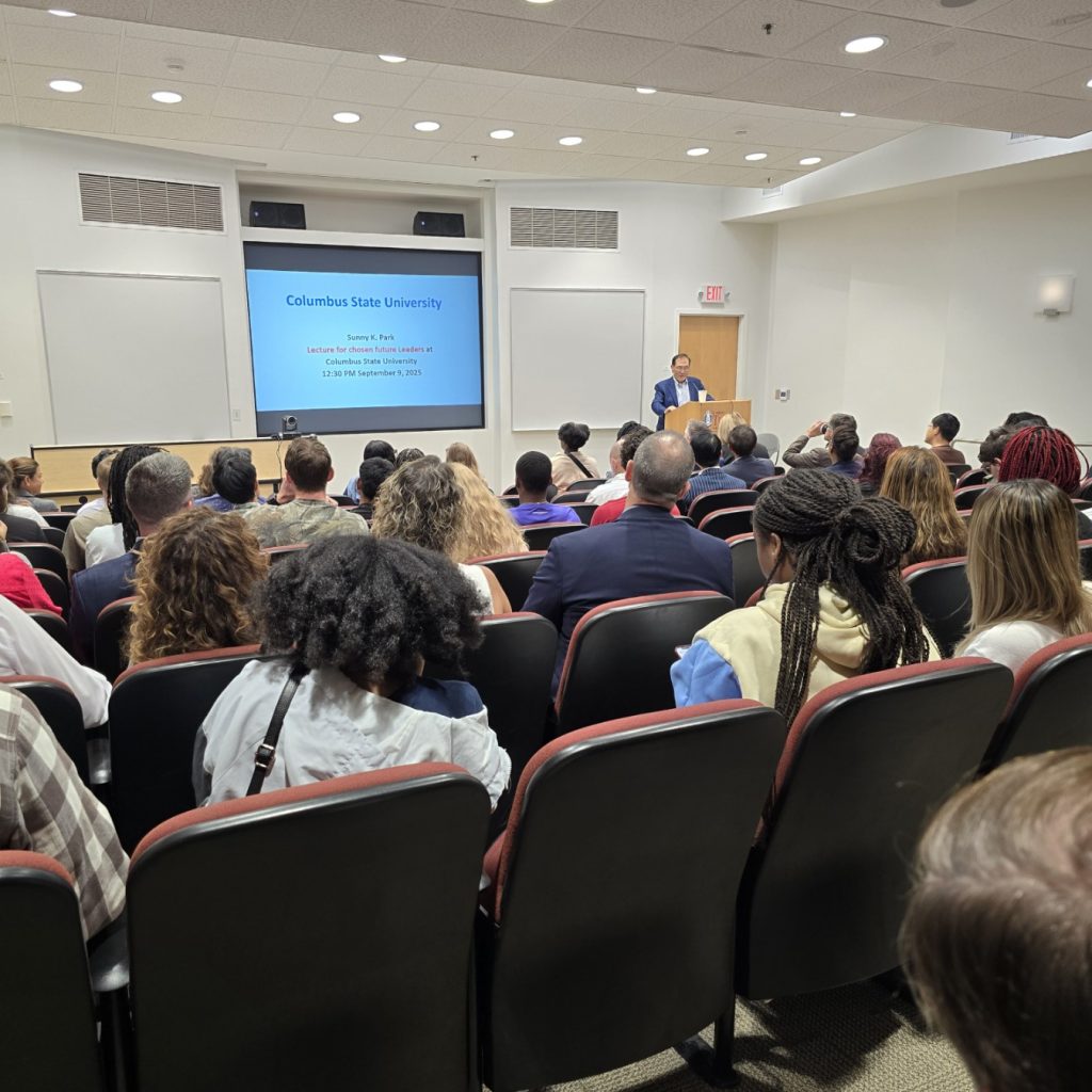 오늘 화창한 날씨 속에서 아틀랜타에서 오신 박선근 회장님(Sunny K. Park)의 특별 강연이 콜럼버스 주립대학교 Turner College Auditorium에서 열렸습니다. 이날 강연에는 60여 명의 학생과 교직원들이 모여, 사업가로서 그리고 봉사자로서 평생을 살아온 박 회장님의 이야기에 귀 기울였습니다.